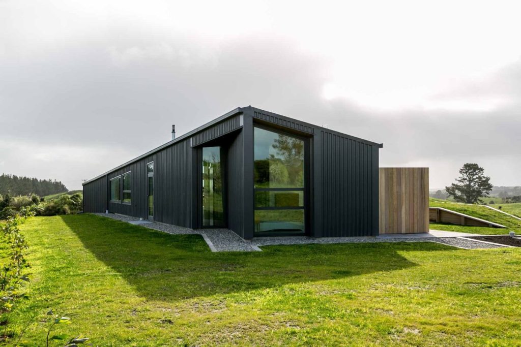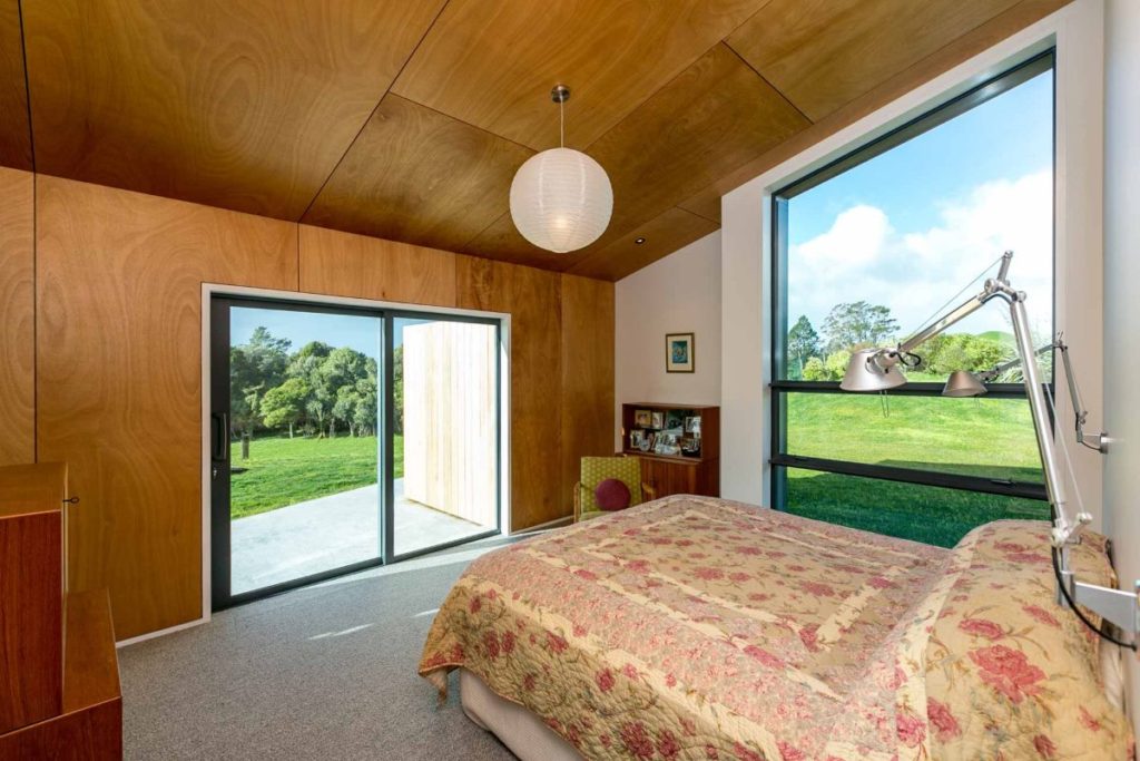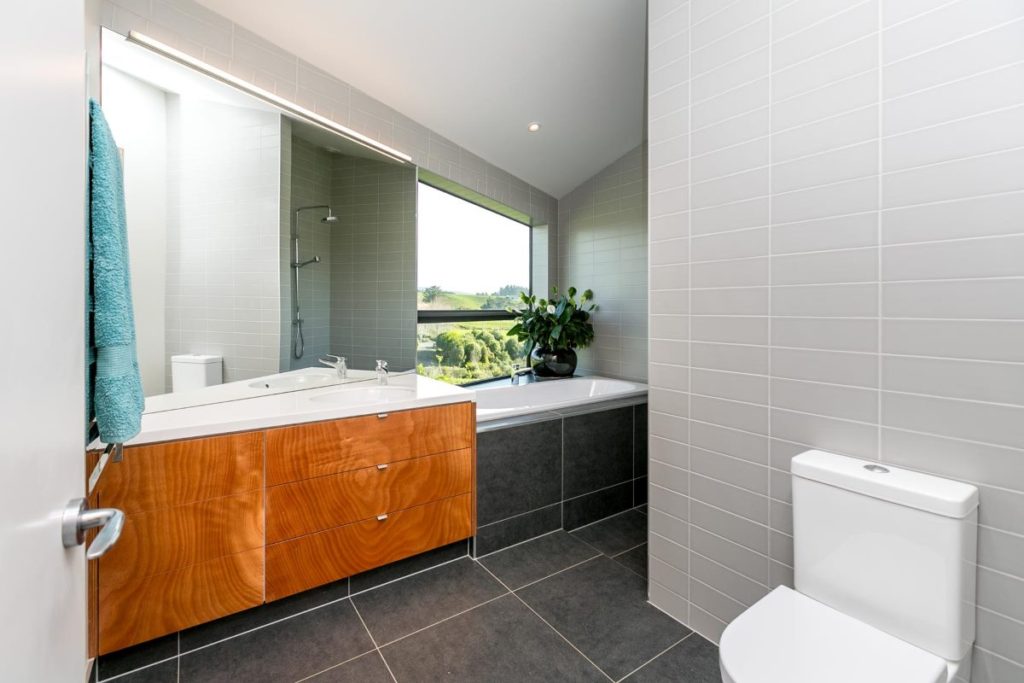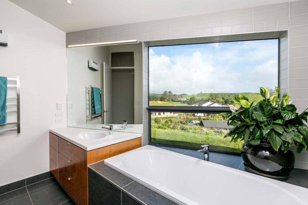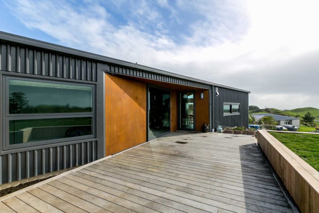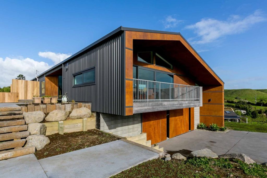 This large New Plymouth house is cut into a hillside in Omata. The garden has been built with macrocarpa sleepers that lead up the deck, with raised garden beds, and an outdoor bar.